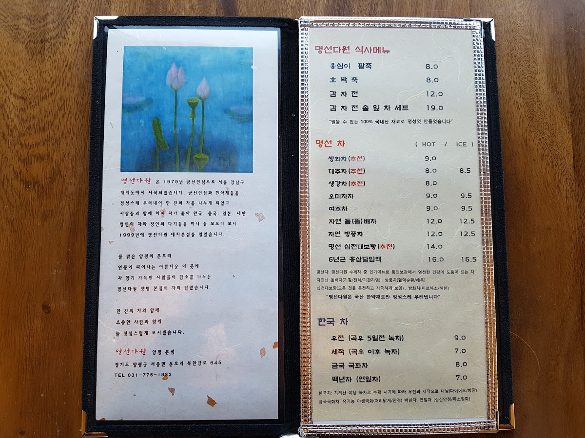 MyeongSeonDaWon, nestled in the serene setting of Yangpyeong-gun, offers an enticing menu that pays homage to traditional Korean tea culture. This cozy café invites guests to indulge in a range of exquisite teas such as fragrant boicha and rich sanghwa tea. The highlight of the menu is undoubtedly their signature red bean porridge, patjuk, served with delightful chewy rice balls, providing a warm and comforting experience.